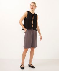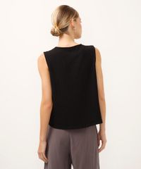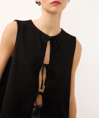 Regata confeccionada em tecido com toque leve. A peça possui modelagem reta com caimento solto, decote redondo, alças largas e sem mangas, detalhe frontal com amarração, tecido texturizado e acabamento pespontado.