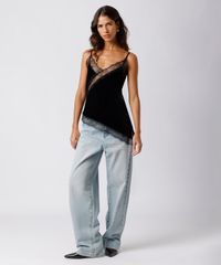 Regata de pijama feminina confeccionada em tecido plano acetinado com detalhes em renda. A peça tem modelagem reta e caimento solto ao corpo. O modelo tem decote V, alças finas ajustáveis e barra assimétrica.