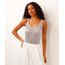 Regata feminina confeccionada em tricot com fios metalizados tramas abertas. A peça tem modelagem reta e caimento solto ao corpo. O modelo tem decote redondo e alças médias.