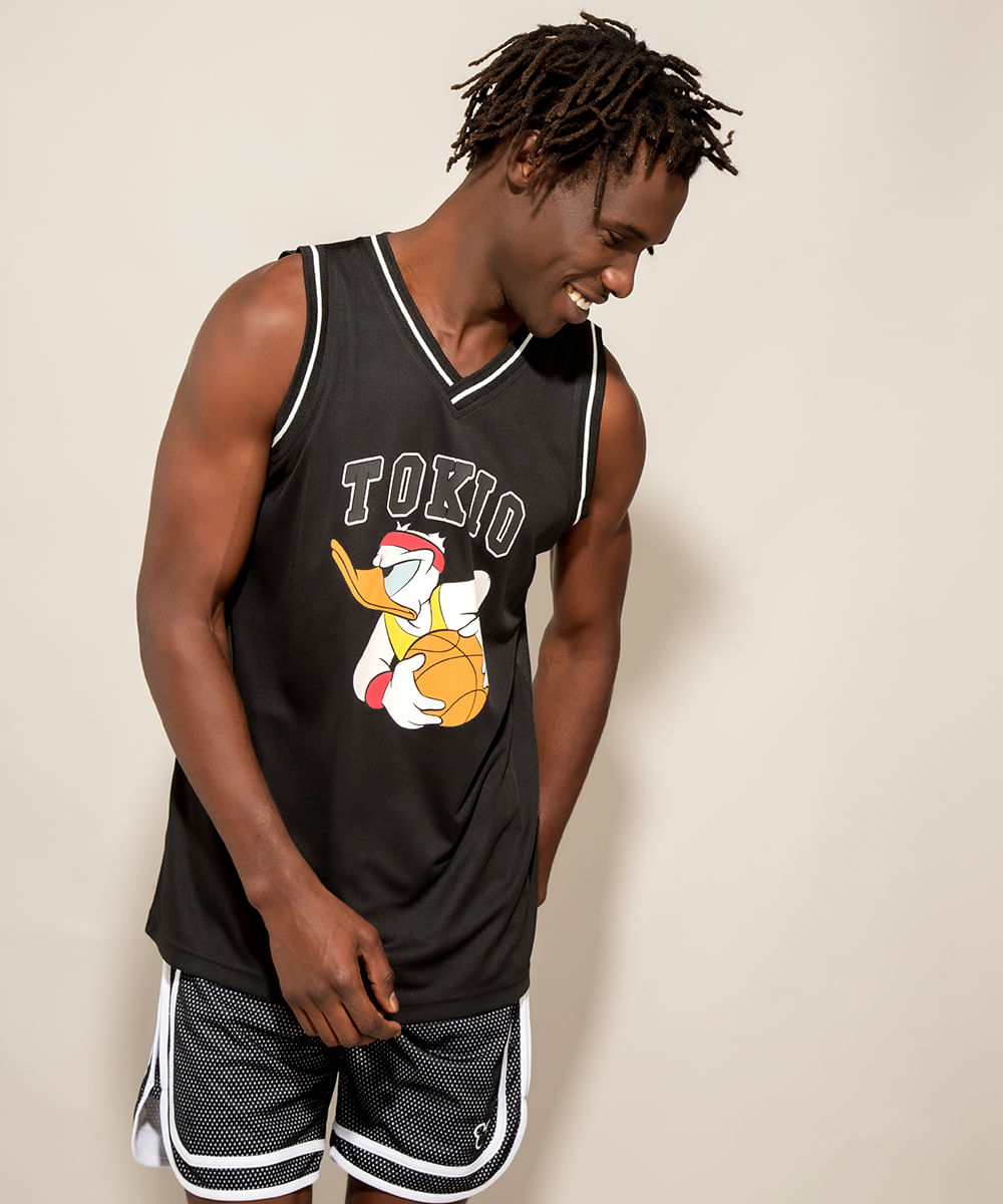 Regata esportiva masculina confeccionada em malha leve e respirável. O modelo tem caimento soltinho e gola V. As cavas e gola tem acabamento em retilínea. Possui estampa frontal do Pato Donald e escrita "Tokio".