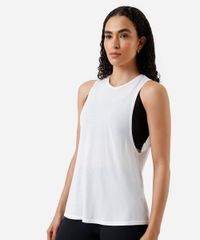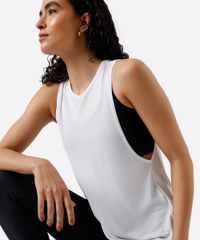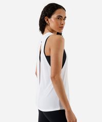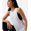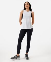 Regata feminina confeccionada em malha de poliamida. A peça tem modelagem reta e caimento solto ao corpo. O modelo tem decote redondo e alças largas. Detalhe de acabamento com recorte vazado na parte posterior.