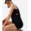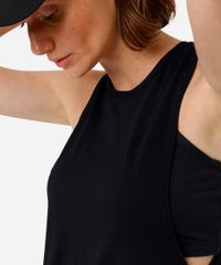 Regata feminina confeccionada em malha de poliamida. A peça tem modelagem reta e caimento solto ao corpo. O modelo tem decote redondo e alças largas. Detalhe de acabamento com recorte vazado na parte posterior.