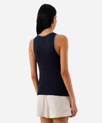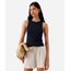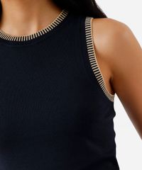 Regata feminina confeccionada em tricot leve de viscose e poliamida. A peça tem modelagem reta e caimento solto ao corpo. O modelo tem decote redondo e alças largas. Detalhe de acabamento canelado na barra, decote e cavas.