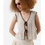 Regata feminina confeccionada em tricot texturizado. A peça tem modelagem reta e caimento solto ao corpo. O modelo tem decote em V, toras finas para amarração e fechamento e alças largas. Detalhe de acabamento com bordado contrastante no decote e nas cavas.
