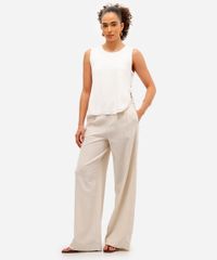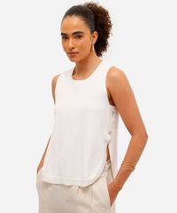 Regata feminina confeccionada em tricot leve de viscose e poliamida. A peça tem modelagem reta e caimento solto ao corpo. O modelo tem decote redondo, alças largas, botões resinados aplicados nas laterais, fendas laterais e acabamento canelado na barra e laterais.