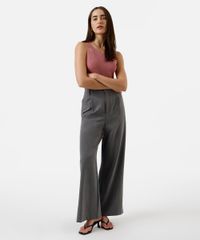 Regata confeccionada em tricot de trama trançada com fios metalizados. Possui modelagem reta, caimento levemente solto, alças largas com cava, decote redondo fechado, halter neck e acabamento em ribana