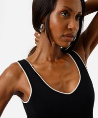 • Acabamento contrastante no decote e nas cavas, que confere um toque moderno e diferenciado à peça.