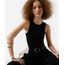 Regata feminina confeccionada em poliamida com fios de lurex aplicados na horizontal, toque canelado e macio. Possui modelagem reta, caimento justo ao corpo, decote redondo, design sem mangas e cavas amplas.