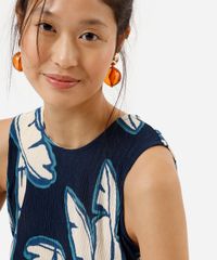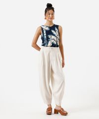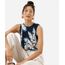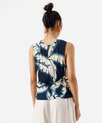 Regata feminina confeccionada em tecido plissado com estampa de folhagens. A peça tem modelagem reta e caimento solto ao corpo. O modelo tem decote redondo, abertura posterior por botão e alças largas. Detalhe de acabamento pespontado na barra.