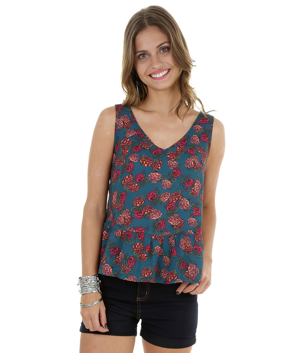 Regata confeccionada em tecido plano de toque macio. O charme do modelo é a padronagem floral. O recorte inferior com franzidos deixa o caimento mais fluido. O decote é V e as alças são médias.