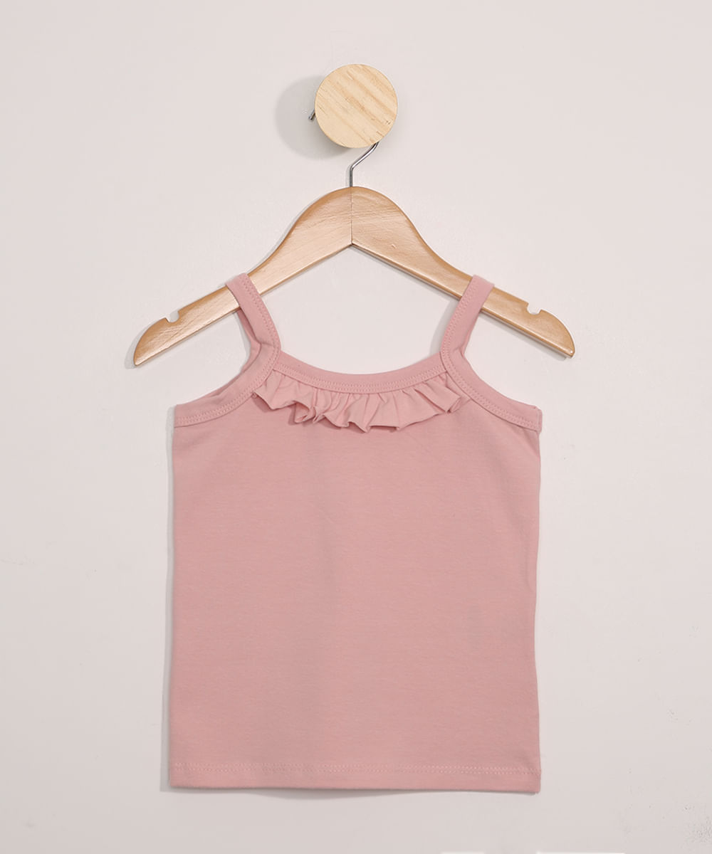 Regata infantil desenvolvida em malha. Tem aplicação frontal de babados. O decote é redondo e as alças são médias.
