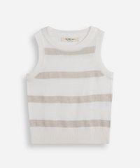 Regata confeccionada em tricot. Possui modelagem reta, caimento levemente ajustado, gola, barra e cavas com toque canelado, detalhe com listras horizontais e fios de lurex na cor prateada.