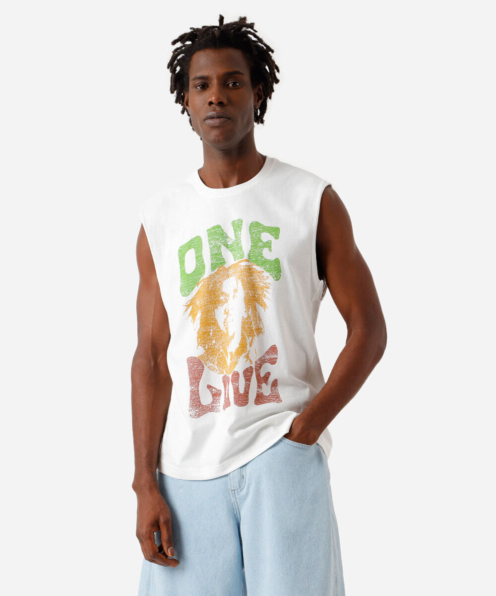 Regata machão confeccionada em algodão. Possui modelagem reta, caimento solto e confortável, gola redonda com toque canelado, design sem mangas, cavas ampals com acabamento à fio, estampa frontal do Bob Marley e acabamento pespontado.