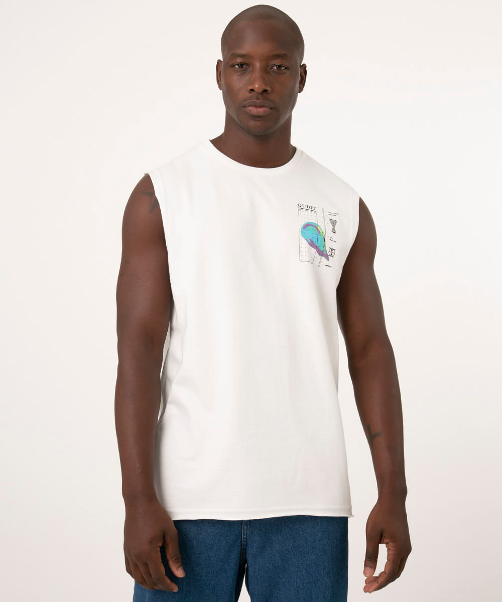 Regata masculina desenvolvida em malha. Possui estampa frontal e posterior com tema de bit quântico. O acabamento das cavas e da barra é a fio. A gola é careca.