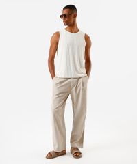 Regata masculina confeccionada em tecido texturizado com estampa em alto relevo. Possui modelagem reta, gola redonda, design sem mangas com cavas amplas e acabamento pespontado.