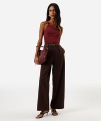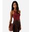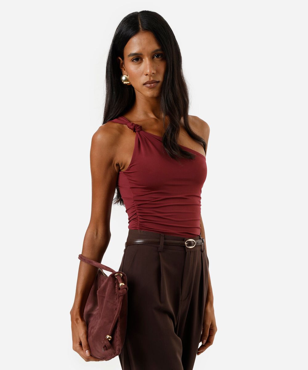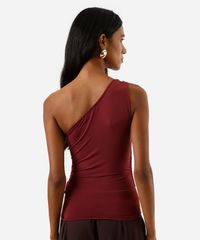Regata feminina confeccionada em malha, com dupla camada de tecido na parte frontal. A peça tem modelagem reta, caimento levemente ajustado ao corpo com franzidos laterais que modelam a silhueta. O modelo tem decote assimétrica e alça larga com detalhe em nó. Detalhe de acabamento pespontado na barra.
