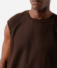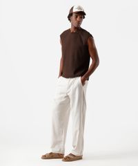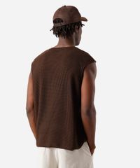Regata masculina confeccionada em tricot texturizado. A peça tem modelagem reta e caimento solto ao corpo. O modelo tem gola redonda e alças largas com recorte estilo raglan nos ombros.