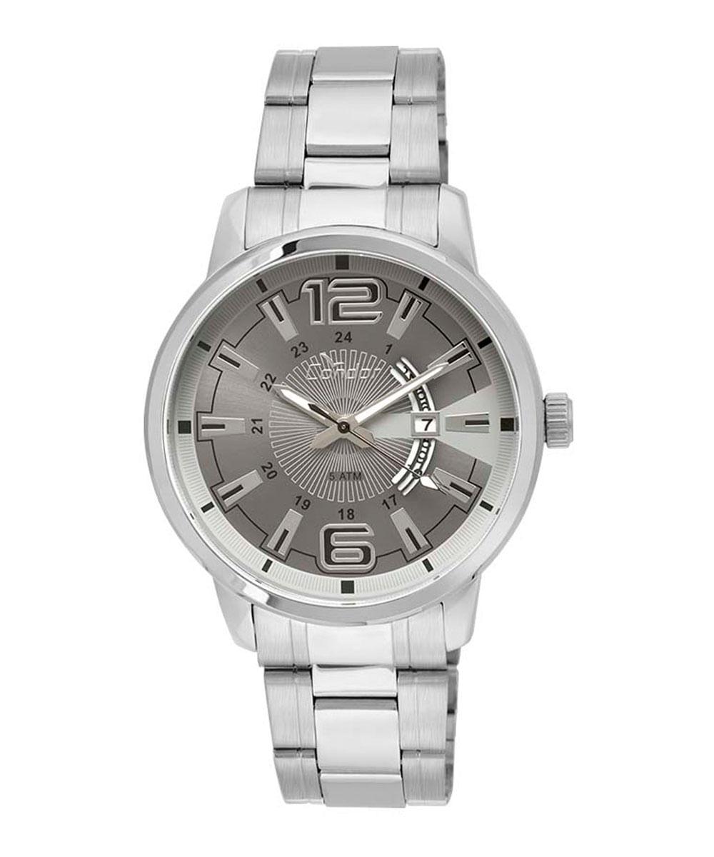 Relógio com pulseira feita em aço. A caixa de formato redondo foi desenvolvida em metal. O visor é analógico com fundo na cor cinza. Possui calendário. A resistência é de 5 ATM, permitindo nadar enquanto usa a peça.