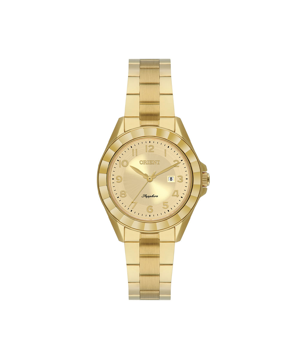 Relógio feminino Orient analógico-calendário fgss1258 c2kx dourado. Desenvolvido em aço com pulseira dourada, visor dourado e caixa aço. Possui resistência à água de 5atm e mecanismo analógico-calendário.
