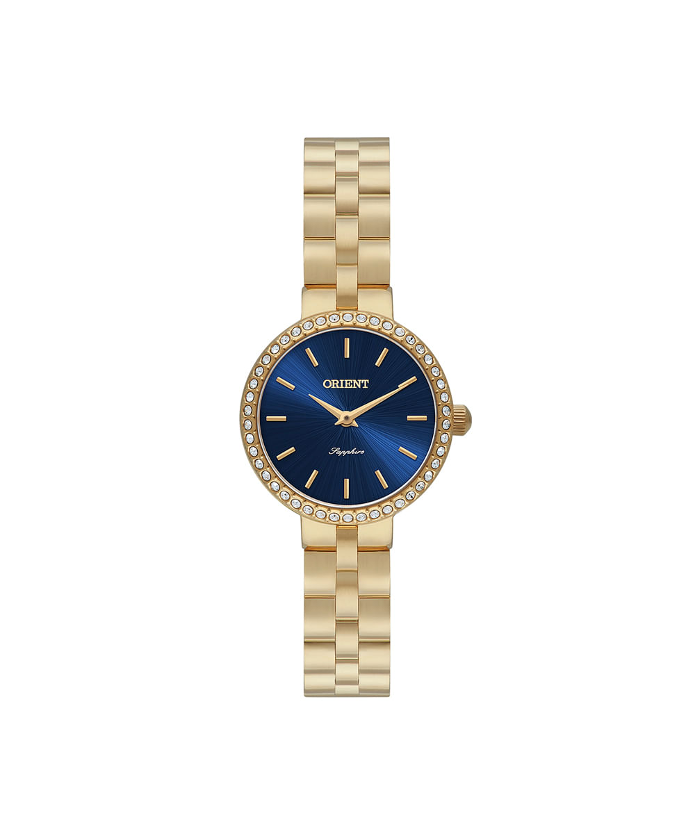 Relógio feminino Orient analógico fgss0242 d1kx dourado. Desenvolvido em aço com pulseira dourada e visor azul. Possui resistência à agua de 3atm e mecanismo analógico.