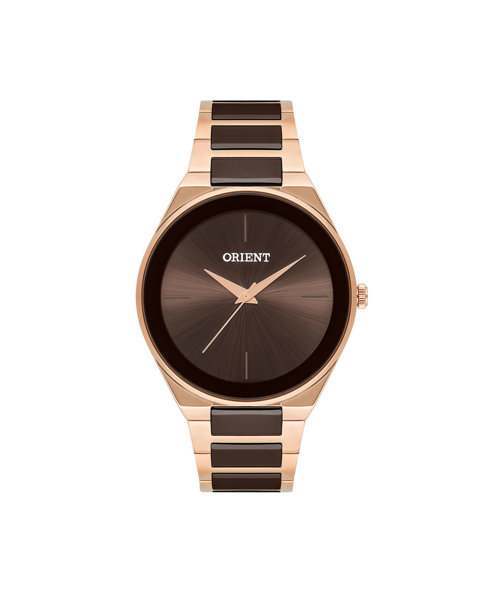 Relógio feminino Orient analógico ftsk0002 n1rn rosê. Desenvolvido em aço com pulseira mista e visor marrom. Possui resistência à agua de 5atm e mecanismo analógico.
