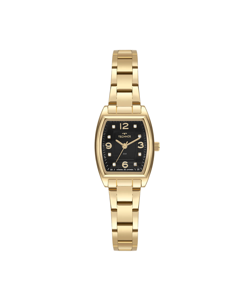 Relógio feminino Technos analógico 2035mxp 1p dourado. Desenvolvido em aço com pulseira dourada, visor preto e caixa metal. Possui resistência à água 5atm e mecanismo analógico.