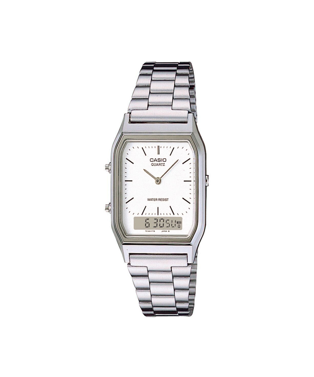 Relógio masculino Casio analógico digital aq 230a 7dmq prateado. Desenvolvido em aço com pulseira prateada, visor branco e caixa aço. Possui resistência à água de wr e mecanismo analógico digital.
