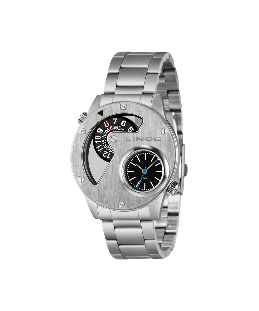 Relógio masculino Lince dual time mrm4820l46 p2sx prateado. Desenvolvido em aço com pulseira prateado e visor preto. Possui resistência à água de 5atm e mecanismo dual time.