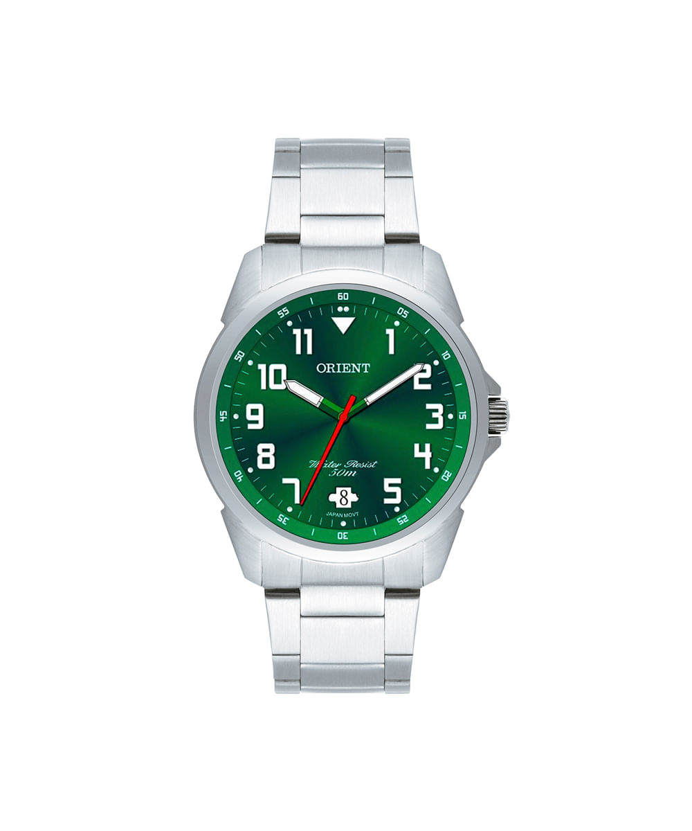 Relógio masculino Orient analógico calendário mbss1154a e2sx prateado. Desenvolvido em aço com pulseira prateada, visor verde e caixa aço. Possui resistência à água 5atm e mecanismo analógico calendário.