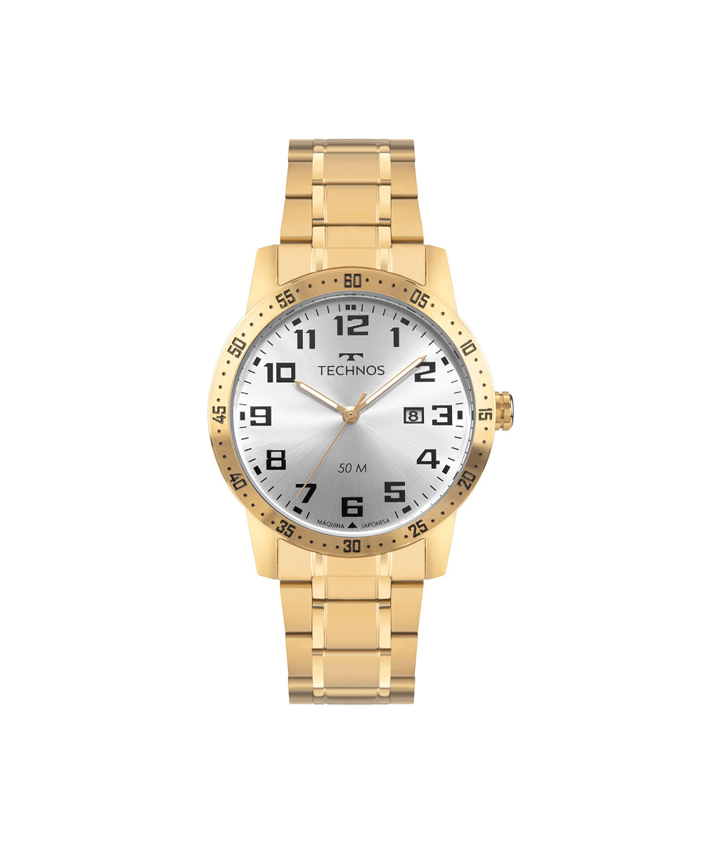 Relógio masculino Technos analógico calendário 2115uat 1k dourado. Desenvolvido em aço com pulseira dourada, visor prata e caixa metal. Possui resistência à água 5atm e mecanismo analógico calendário.