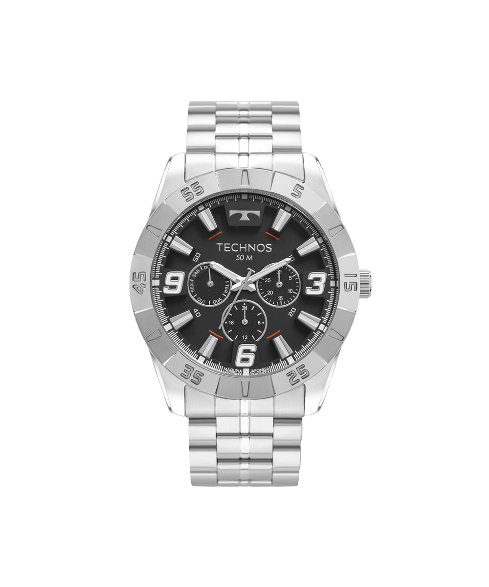 Relógio masculino Technos analógico calendário 6p29alb 1p prateado. Desenvolvido em aço com pulseira prateada, visor preto e caixa metal. Possui resistência à água 5atm e mecanismo analógico calendário.