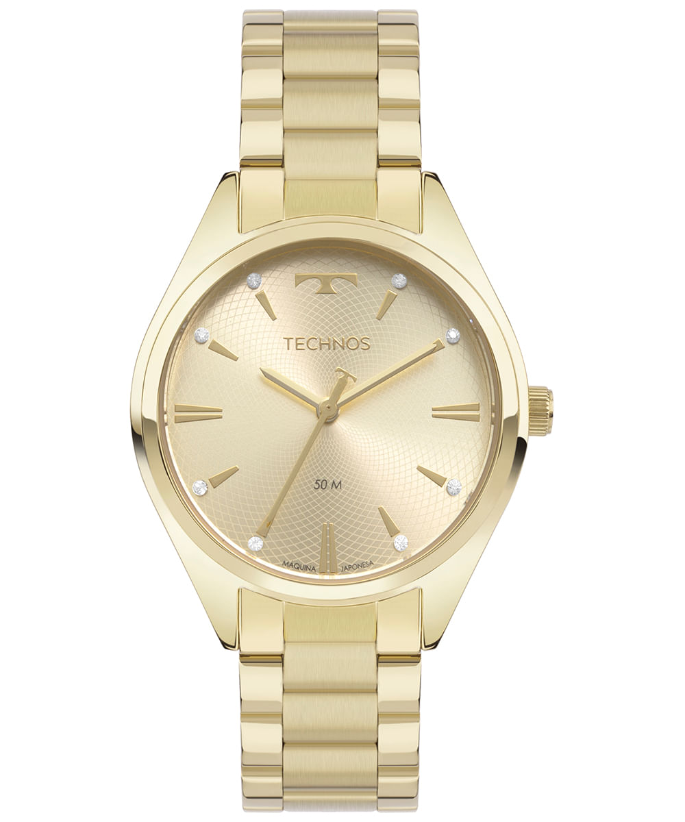 Relógio Technos analógico 2036mqs1x dourado. Produzido em aço, possui pulseira dourada, visor dourado. Com resistência à água de 5 atm e mecanismo analógico. Medidas: 35 x 9,45