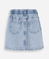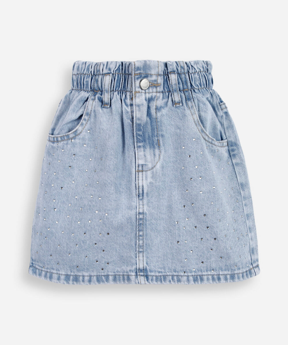 Saia infantil confeccionada em jeans estruturado com aplicação de brilhos na parte frontal. A peça tem modelagem clochard, com construção reta e caimento solto ao corpo. O modelo tem cintura média, cós com passantes para cinto, elástico embutido e fechamento por zíper e botão. Possui dois bolsos frontais e dois aplicados na parte posterior. Detalhe de acabamento pespontado na barra.