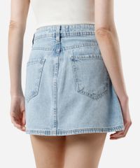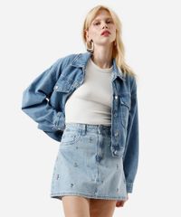 Saia curta feminina confeccionada em jeans estruturado com aplicação de brilhos na parte frontal. A peça tem modelagem evasê com caimento levemente ajustado ao corpo. O modelo tem cintura alta, cós com passantes para cinto e o fechamento é frontal por zíper e botão. Possui três bolsos na parte frontal e dois aplicados na parte posterior. Detalhe de acabamento em pesponto contrastante.