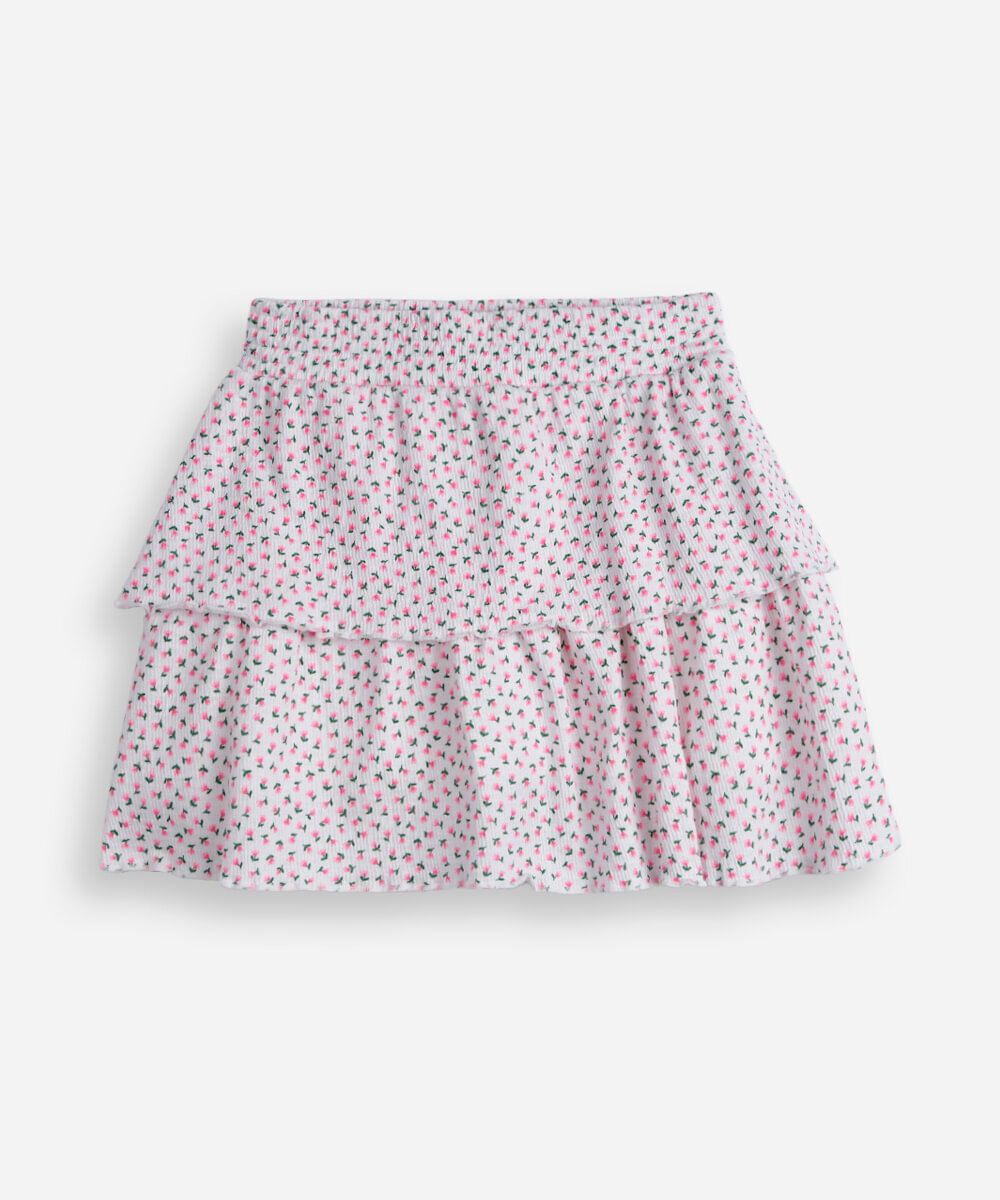 Saia curta infantil confeccionada malha de algodão com textura canelada e estampa floral. A peça tem modelagem godê, com caimento rodado e solto ao corpo e dupla camada de tecido. O modelo tem cintura média, cós com elástico embutido e acabamento simples na barra.
