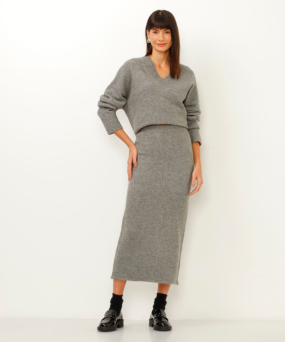 Para um look monocromático e sofisticado, combine esta saia midi com um suéter de tricô no mesmo tom. Se a ideia é um visual mais despojado, aposte em uma camiseta básica e tênis branco. Para ocasiões que pedem mais formalidade, use com uma camisa de seda e botas de salto. A peça também fica ótima com blusas de gola alta e mocassins, criando uma produção clássica e cheia de estilo.