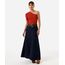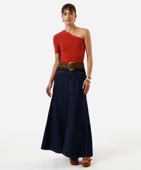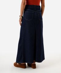 Saia feminina confeccionada em jeans de algodão com lavagem escura. A peça tem modelagem evasê, comprimento longo e caimento solto. Possui cintura alta, cós com passantes aplicados, três bolsos frontais e dois bolsos posteriores, nesgas decorativas e fechamento frontal com botão e zíper. Acabamento pespontado.