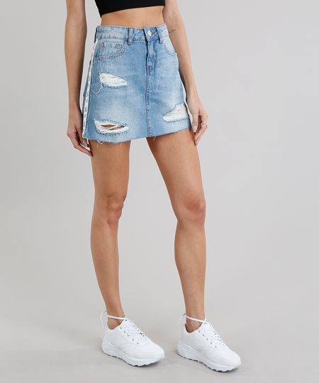 Saia feminina confeccionada em jeans com lavagem destroyed, com rasgos e puídos. As laterais tem faixas esportivas "Hi Bye". A parte frontal conta com três bolsos enquanto a parte posterior tem dois. O cós tem passantes e fechamento por botão e zíper. A barra tem acabamento a fio.