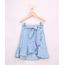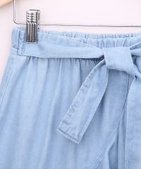 Saia infantil feminina desenvolvida em jeans leve. A peça tem transpasse frontal fixo e comprimento midi. O acabamento forma babado. O cós tem elástico embutido com faixas fixas nas laterais permitindo amarração.