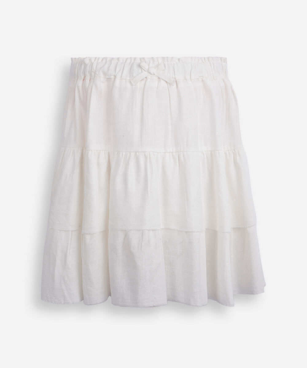 Saia juvenil confeccionada em viscose com linho. Possui modelagem evasê, comprimento curto, cintura alta, cós franzido com elástico embutido, detalhe com laço aplicado, detalhe de marias com babado sobreposto, barra à fio e forro interno de short.
