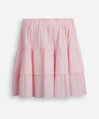Saia juvenil confeccionada em viscose com linho. Possui modelagem evasê, comprimento curto, cintura alta, cós franzido com elástico embutido, detalhe com laço aplicado, detalhe de marias com babado sobreposto, barra à fio e forro interno de short.