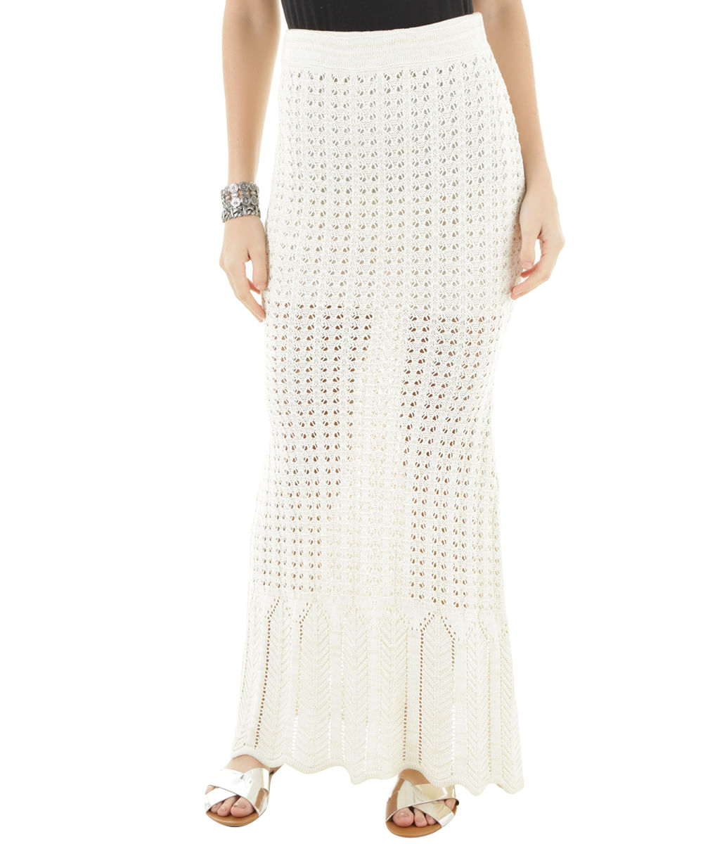 Saia longa desenvolvida em crochê. O diferencial é a aplicação de fios metalizados dando um leve brilho à peça! O modelo tem cós com elástico embutido e forro em malha.