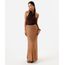 Saia longa feminina confeccionada em tricot com textura canelada. A peça tem modelagem evasê com caimento levemente ajustado ao corpo e barras amplas. O modelo tem cintura alta e cós com elástico embutido.