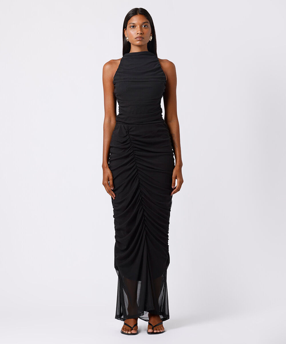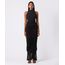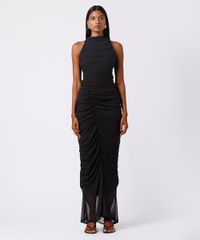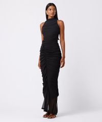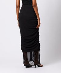 Saia longa feminina confeccionada em tule de malha. A peça tem modelagem reta com caimento levemente ajustado ao corpo e franzidos que modelam a silhueta. O modelo tem cintura alta, cós com elástico embutido, forro em malha e acabamento pespontado na barra.