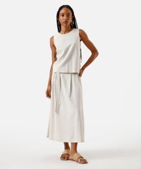 Saia midi feminina confeccionada em tecido plano com viscose e linho. A peça tem modelagem evasê com caimento solto ao corpo. O modelo tem cintura alta, cós com elástico embutido, passantes para cinto, faixa fixa para amarração e pregas decorativas.  Detalhe de acabamento pespontado na barra.