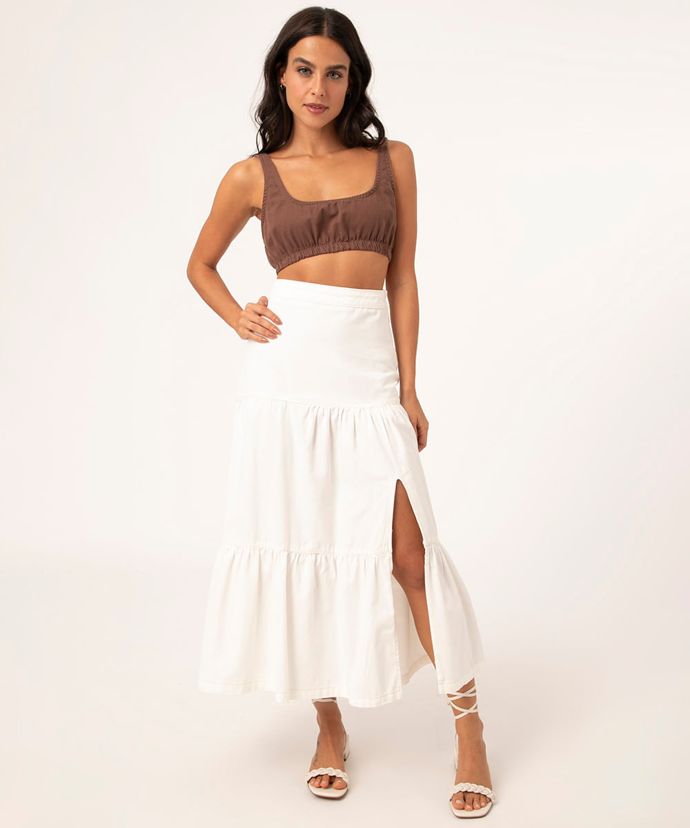 Renove seu estilo com esta saia midi de sarja, uma peça que combina feminilidade e tendências atuais. Confeccionada em sarja 100% algodão, ela oferece um caimento estruturado e confortável, ideal para diversas ocasiões. Seu design com recortes e fenda frontal traz um ar moderno e cheio de movimento para as suas produções.