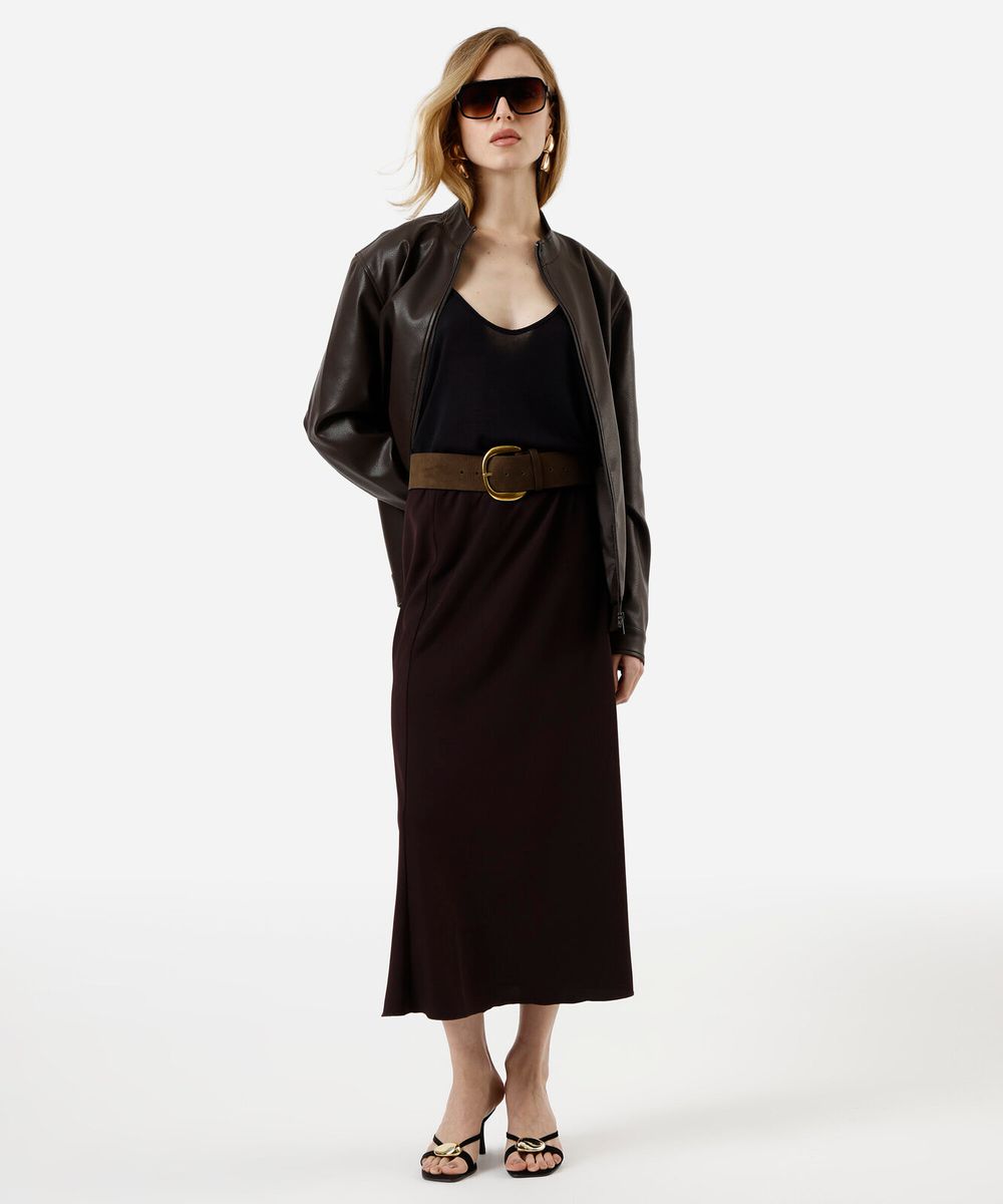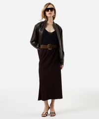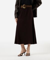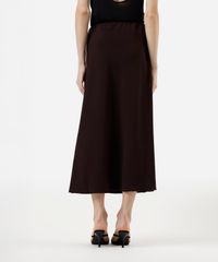 Saia midi feminina confeccionada em malha. A peça tem modelagem evasê com caimento rodado e solto ao corpo. O modelo tem cintura alta e cós com elástico embutido. Detalhe de acabamento simples na barra.