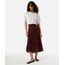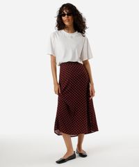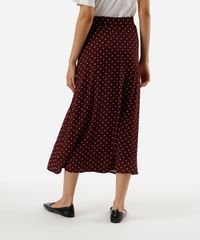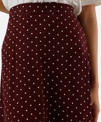 Saia midi feminina confeccionada em tecido plano de viscose com estampa poá. A peça tem modelagem evasê com caimento rodado e solto ao corpo. O modelo tem cintura alta, cós liso e fechamento por invisível. Detalhe de acabamento pespontado na barra.