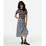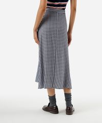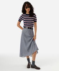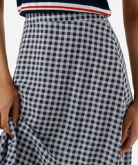 Saia midi feminina confeccionada em tecido plano de viscose com estampa xadrez vichy. A peça tem modelagem evasê com caimento rodado e solto ao corpo. O modelo tem cintura alta, cós liso e fechamento por invisível. Detalhe de acabamento pespontado na barra.