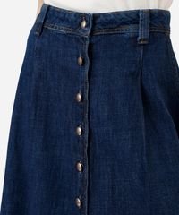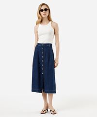 Saia midi feminina confeccionada em jeans. A peça tem modelagem evasê com caimento rodado e solto ao corpo. O modelo tem cintura alta, cós com passantes para cinto, pregas frontais e fechamento por botões. Possui dois bolsos faca na parte frontal e acabamento simples na barra.